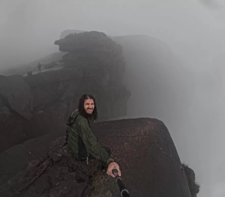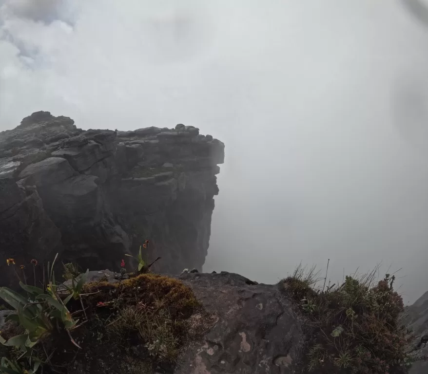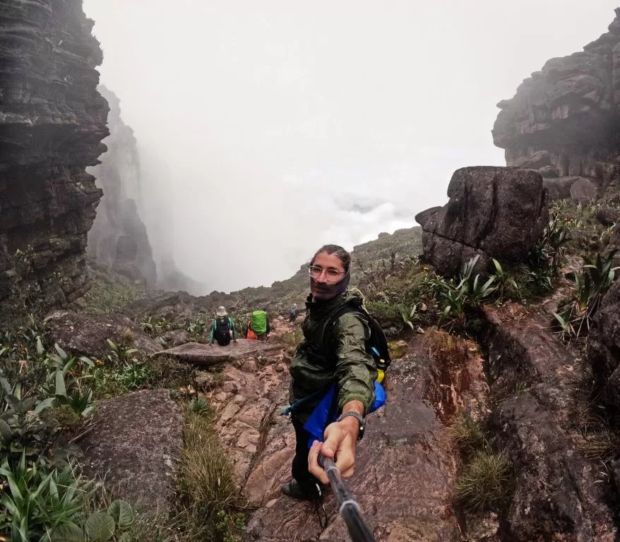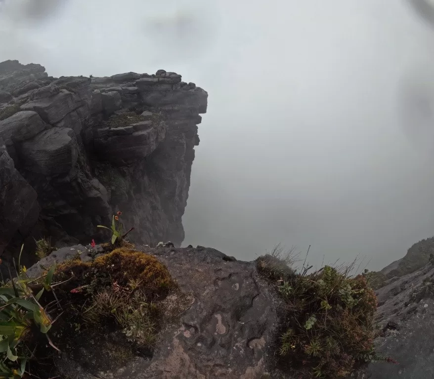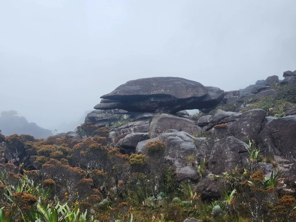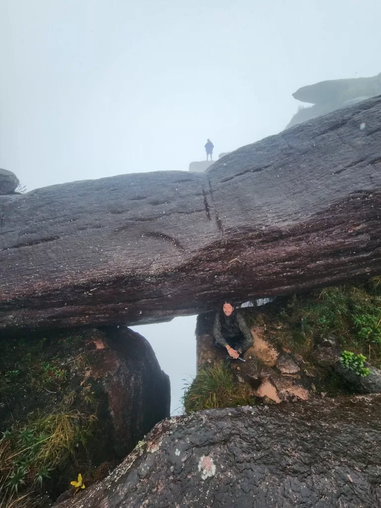 Continuamos nossa jornada sob uma leve garoa e, ao meio-dia, chegamos ao famoso mirante La Ventana, ou “a janela”. De lá, deveríamos ter uma vista impressionante da floresta da Guiana e do Monte Kukenán. No entanto, as nuvens dominavam a paisagem, ocultando a vista. Segundo o guia, isso é comum e acontece em 70% das vezes. Apesar disso, a experiência de estar ali foi emocionante. Para os mais corajosos, era possível ir até a ponta do mirante, mas a sensação de instabilidade no local exigia muita determinação.