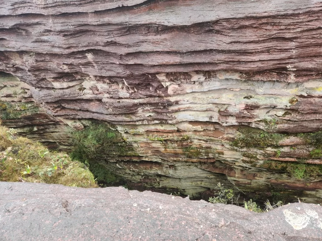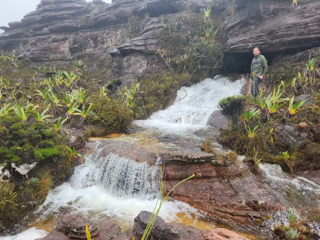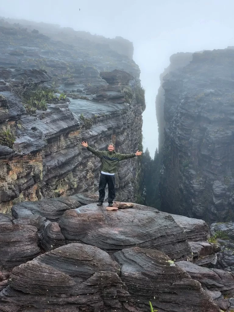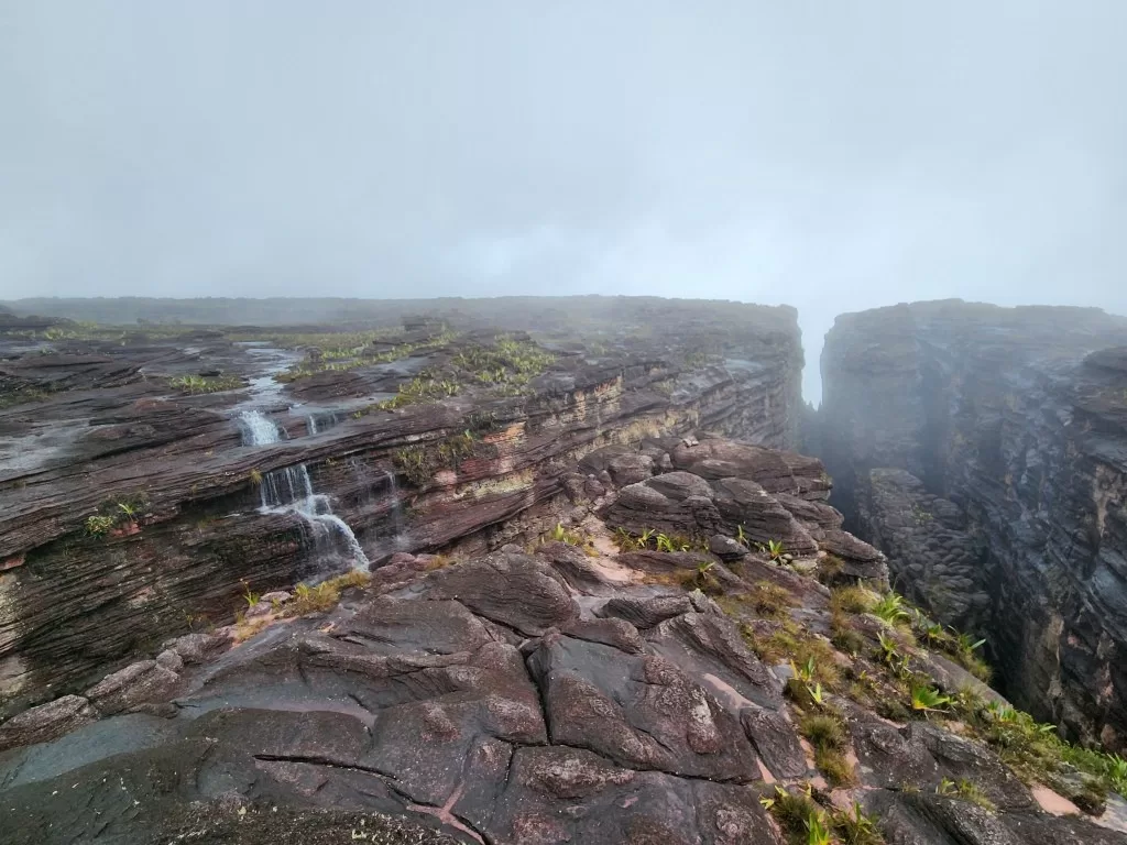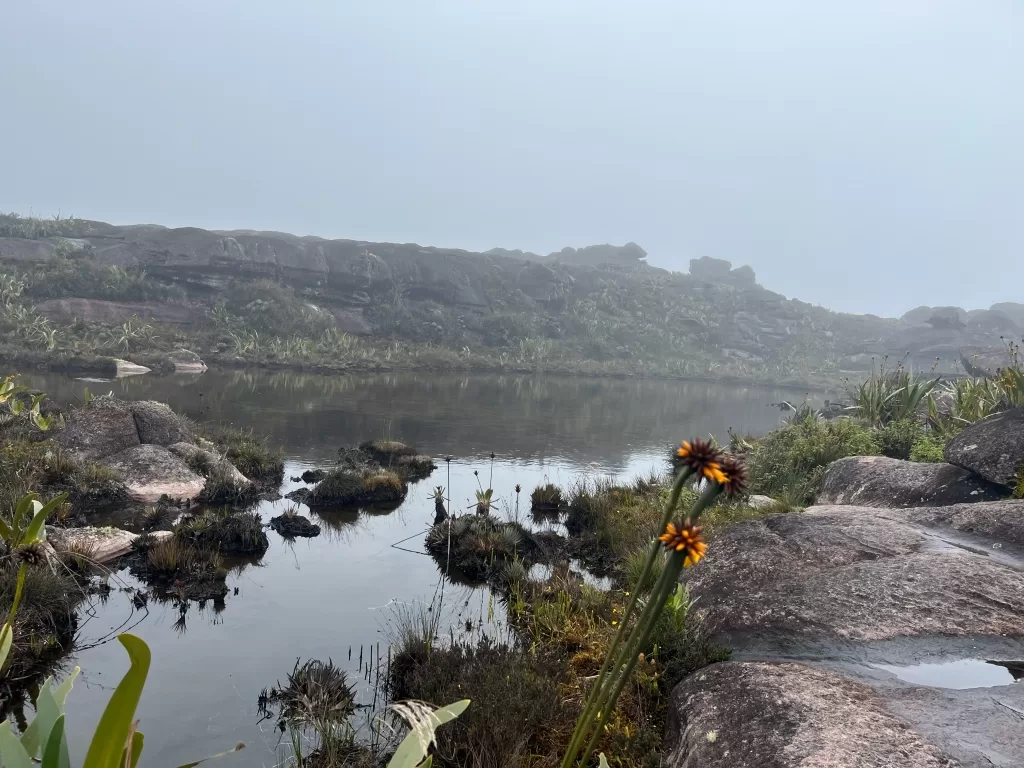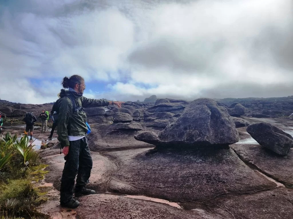 Continuamos nossa jornada sob uma leve garoa e, ao meio-dia, chegamos ao famoso mirante La Ventana, ou “a janela”. De lá, deveríamos ter uma vista impressionante da floresta da Guiana e do Monte Kukenán. No entanto, as nuvens dominavam a paisagem, ocultando a vista. Segundo o guia, isso é comum e acontece em 70% das vezes. Apesar disso, a experiência de estar ali foi emocionante. Para os mais corajosos, era possível ir até a ponta do mirante, mas a sensação de instabilidade no local exigia muita determinação.