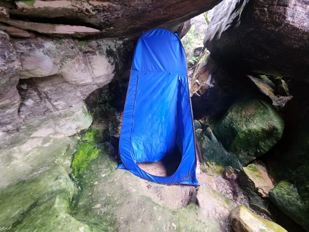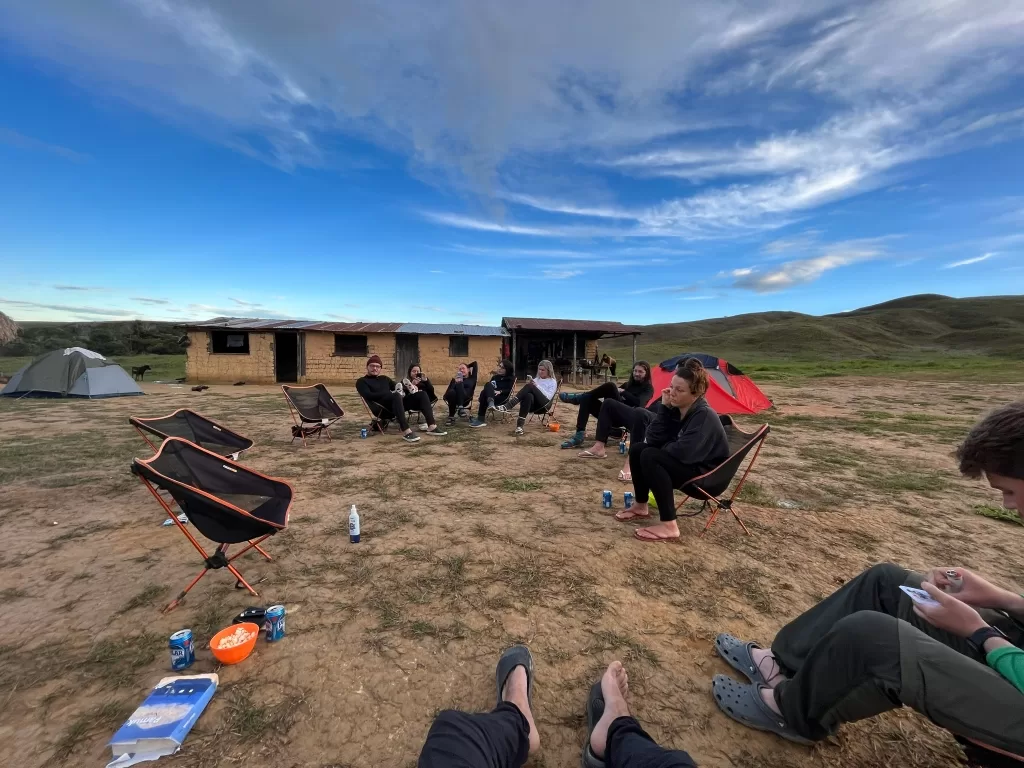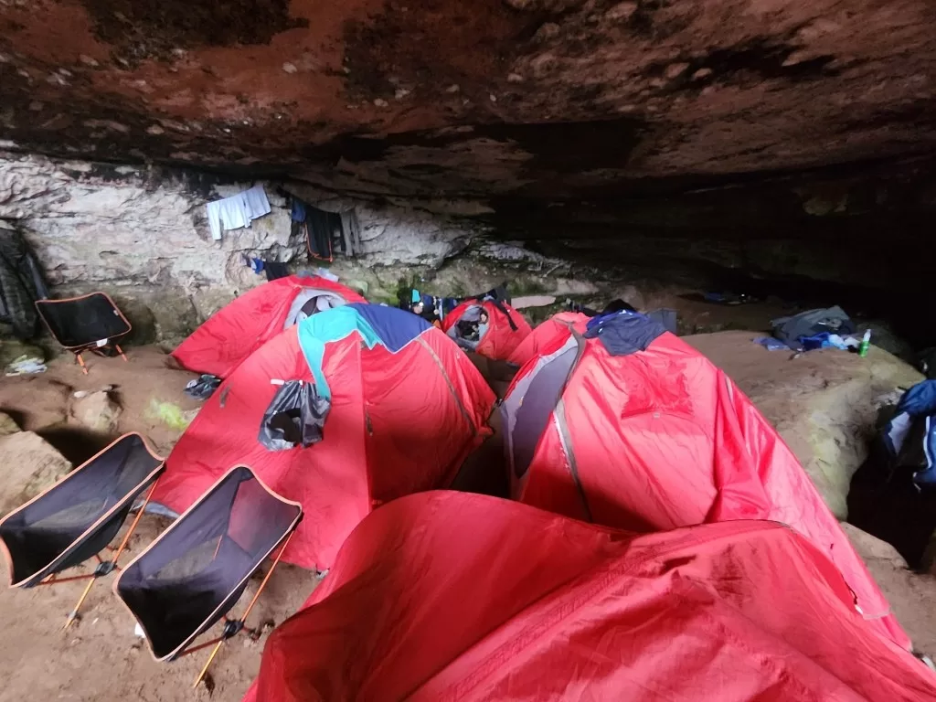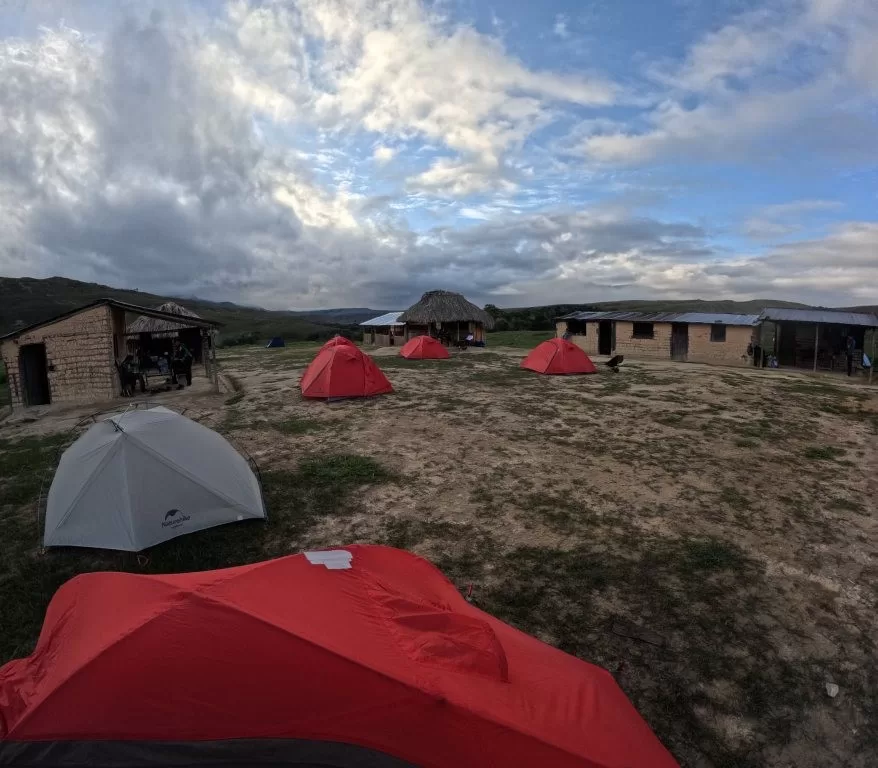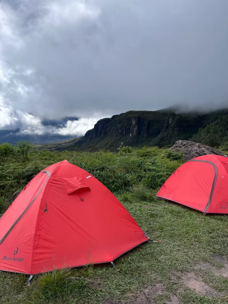 Começou a garoar enquanto seguíamos pelo terreno irregular, com várias subidas e descidas. Por volta das 15h30, chegamos ao “hotel”, uma área protegida sob rochas gigantes onde nossas barracas estavam montadas. Apesar do cansaço, alguns se aventuraram a tomar banho no lago, mesmo com a chuva. Eu, no entanto, preferi trocar minhas roupas molhadas e me aquecer na barraca.