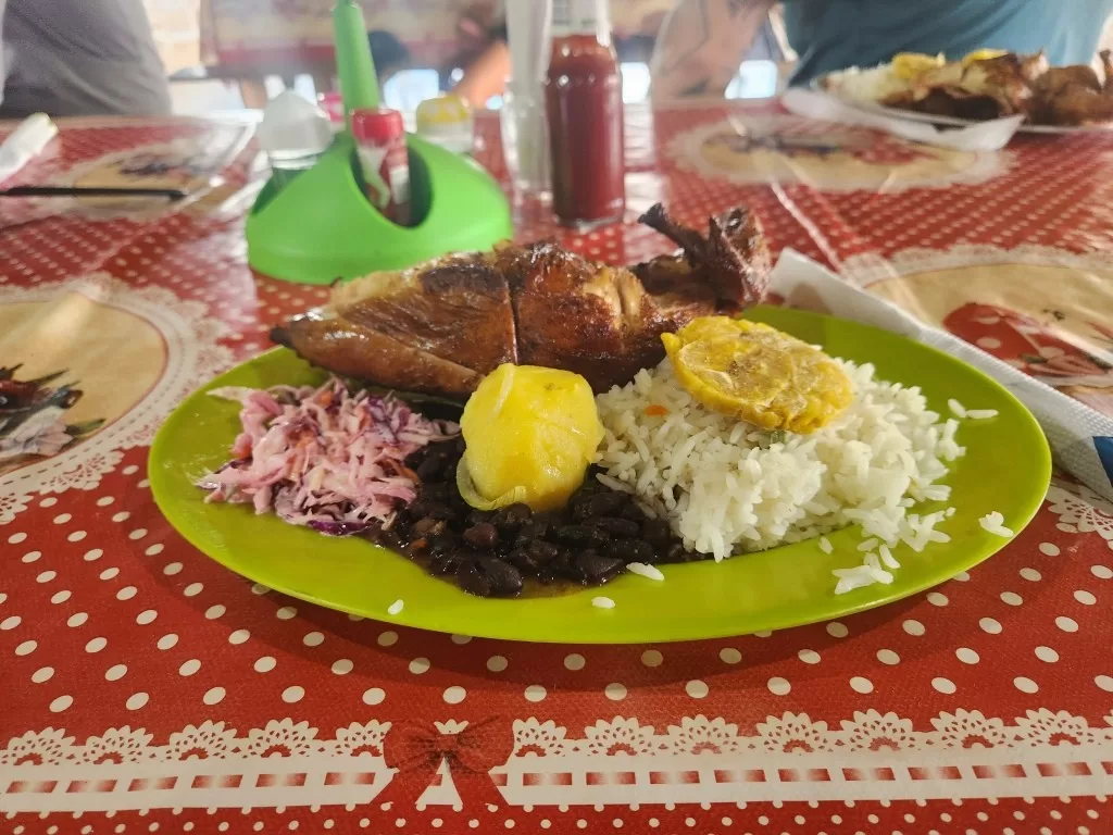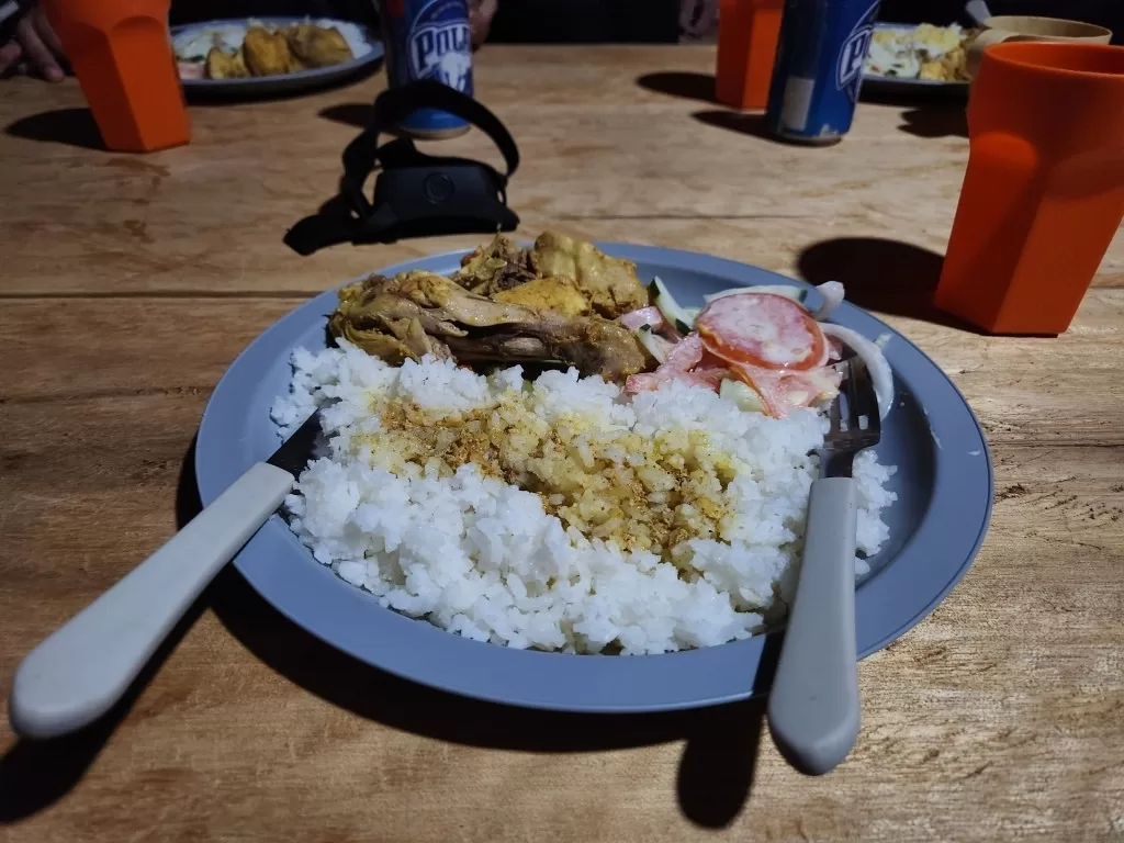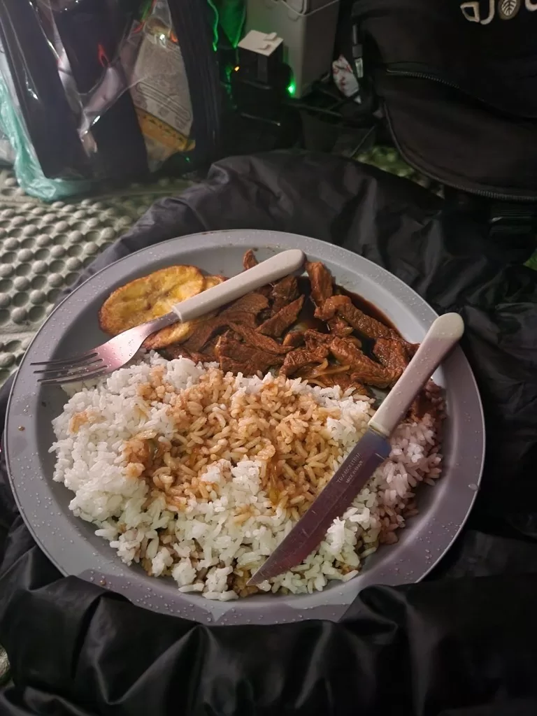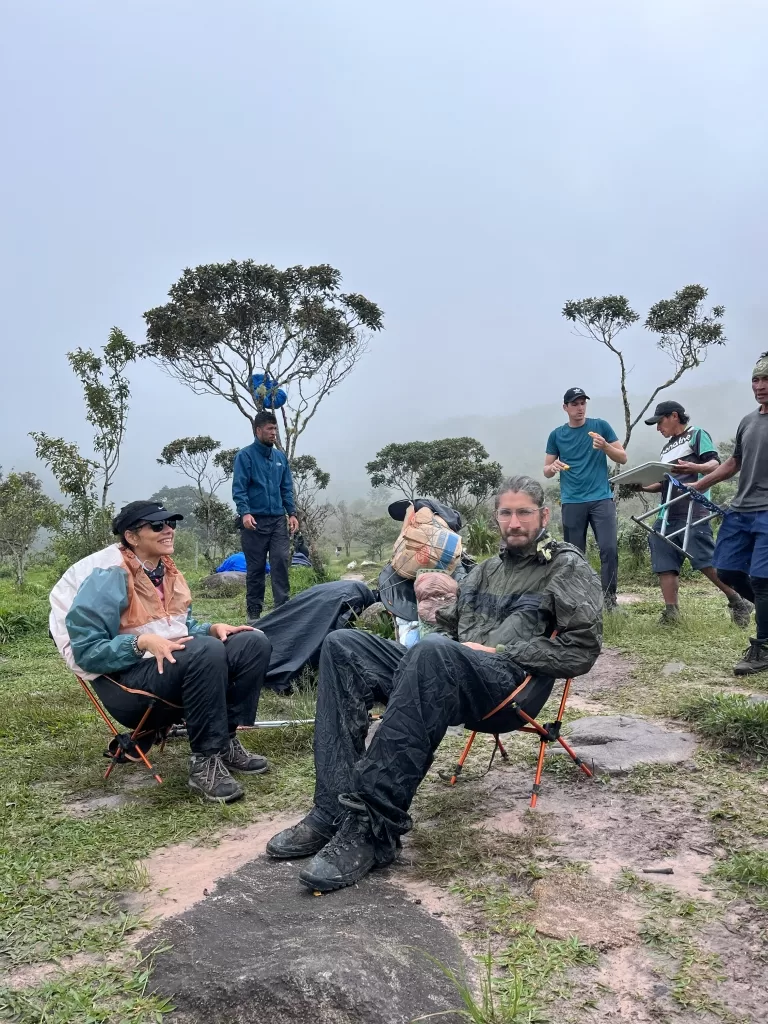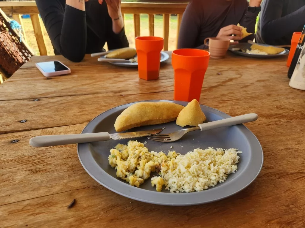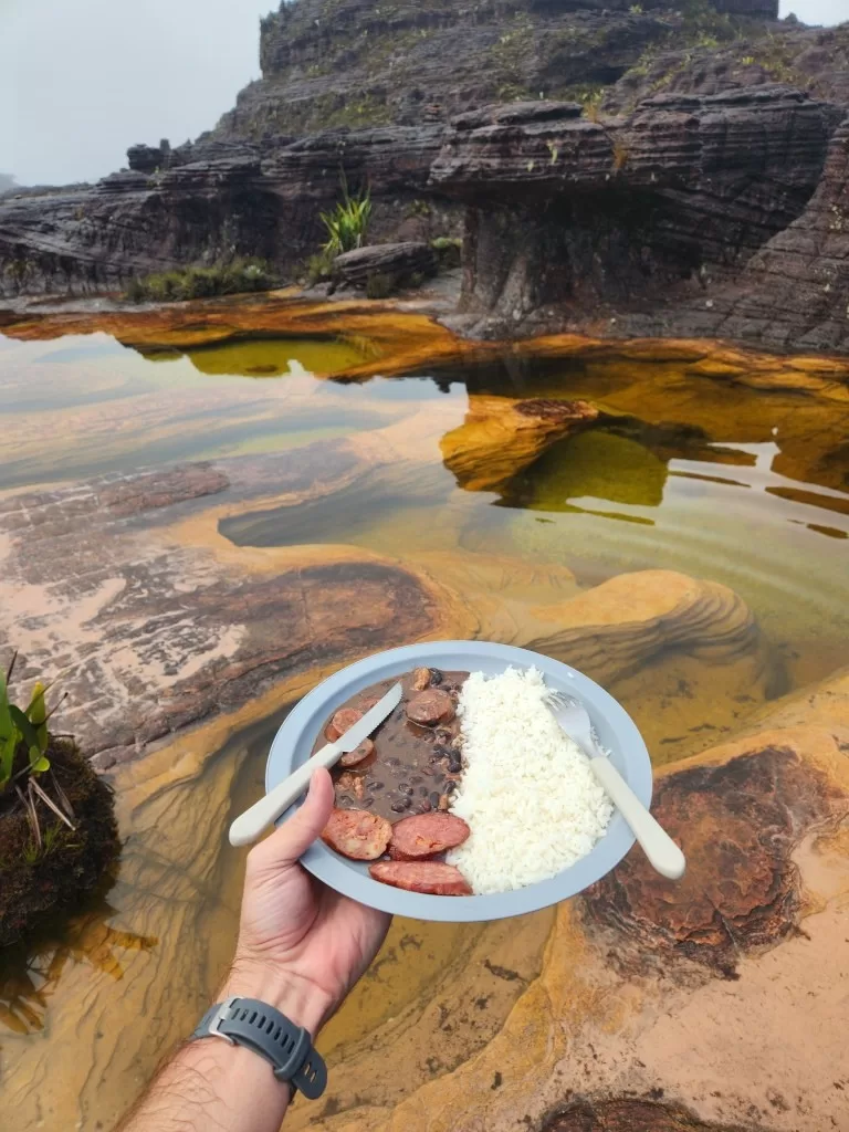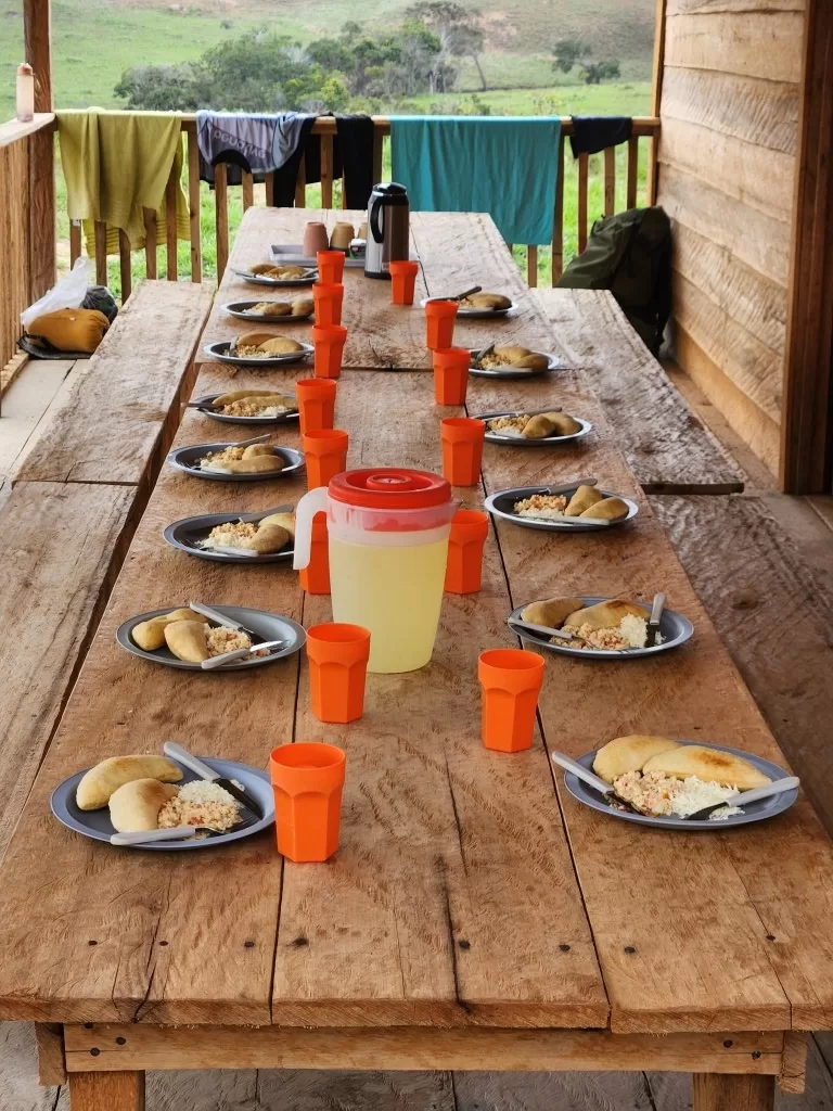 Por volta das 11 horas, chegamos ao acampamento base para uma merecida pausa. Lá, fomos recepcionados com laranjas e melões frescos antes do almoço, um delicioso “arroz chinês venezuelano”. Esse momento foi essencial para renovar nossas energias.