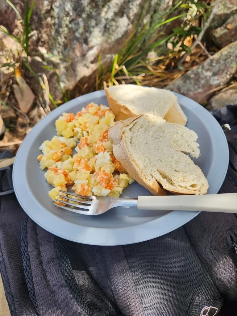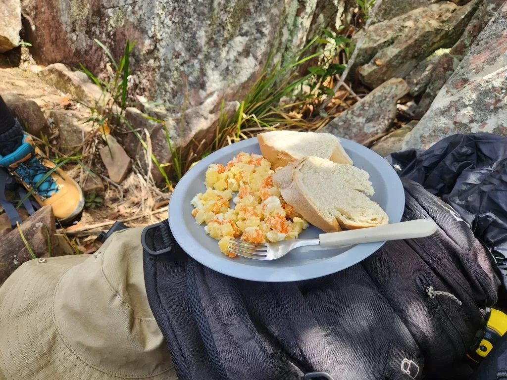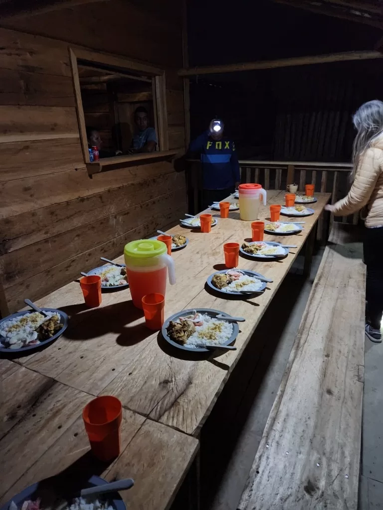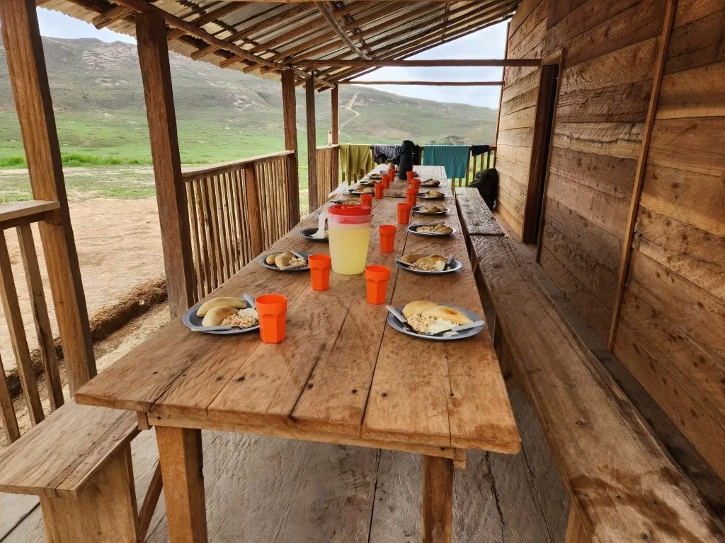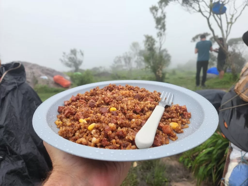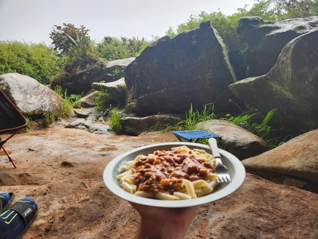 Já do lado de fora, fomos recebidos por uma chuva forte, mas nada que diminuísse nosso entusiasmo. Chegando ao acampamento, encontramos uma recepção calorosa com abacaxi e goiabada. Pouco depois, o almoço foi servido: macarrão com molho de atum, uma refeição simples, mas que caiu muito bem depois da trilha.