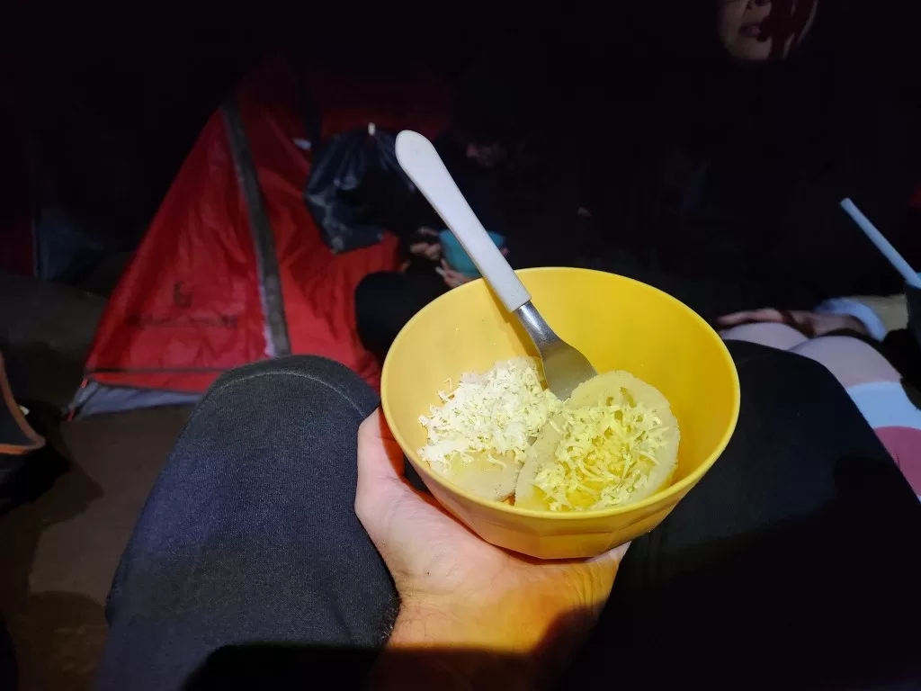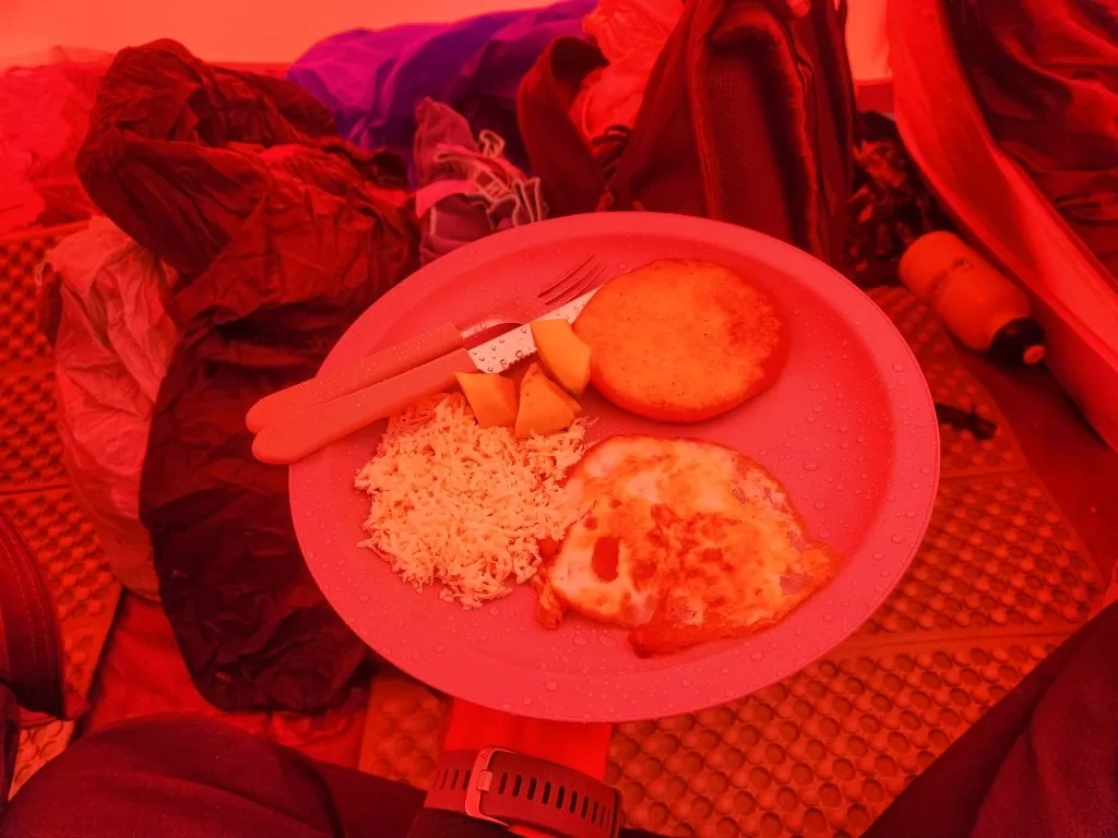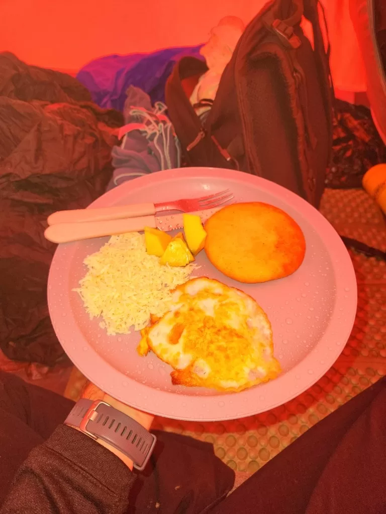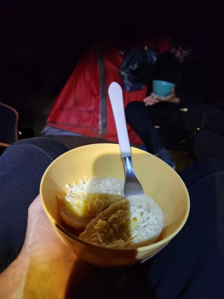 Conforme o dia foi chegando ao fim, o cansaço começou a nos alcançar. Às 19h, foi servido o jantar: uma polenta com queijo que, sinceramente, não agradou muito, mas foi suficiente para encerrar o dia. Logo depois, quase todos nós já estávamos recolhidos em nossas barracas, preparando-nos para o próximo desafio: a descida do Monte Roraima.