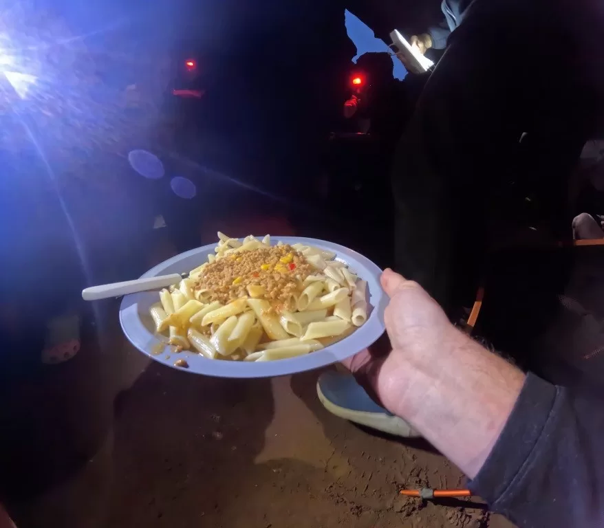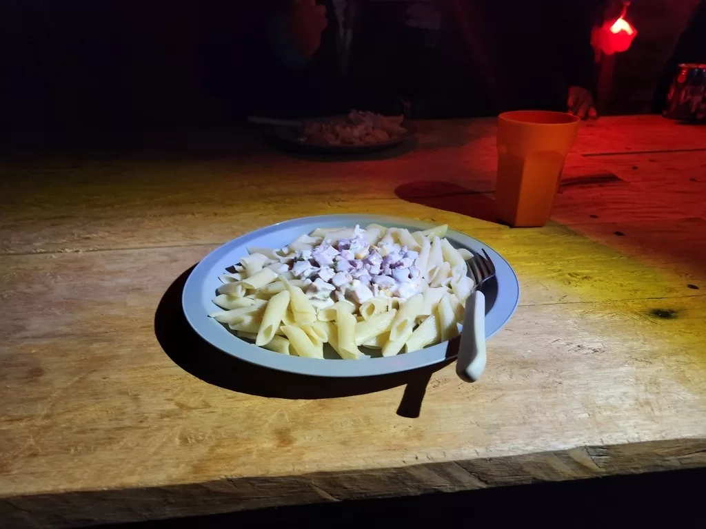No final da tarde, o frio começou a apertar. Nosso jantar foi penne à bolonhesa, um prato quente e delicioso que revigorou nossos corpos e almas. Passamos a noite conversando, trocando histórias e nos conhecendo melhor. Foi um momento especial, de união e companheirismo.