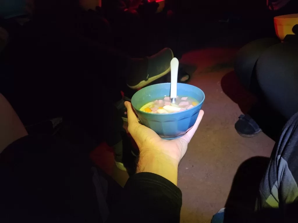 O cardápio da noite foi macarrão à parisiense, servido em meio a um clima de celebração. A alegria e a emoção eram palpáveis, unindo todo o grupo em um sentimento de gratidão e realização. Sabíamos que essa experiência tinha mudado nossas vidas para sempre. Entre risadas e conversas, prolongamos a noite até às 21h, um pouco mais tarde que o habitual.