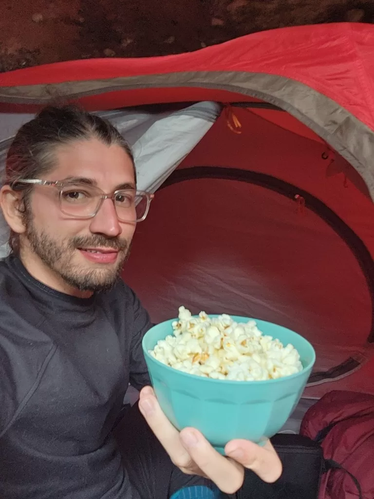 Antes de encerrar o dia, o guia nos levou a um abismo localizado a apenas 100 metros do acampamento. Embora ainda estivesse encoberto pelas nuvens, começava a se abrir, dando sinais de que a paisagem poderia ser revelada em breve. Voltamos ao acampamento, onde fomos recebidos com pipoca quentinha. Aproveitamos para trocar as roupas molhadas por roupas secas e confortáveis, e nos reunimos para conversar até a hora do jantar.