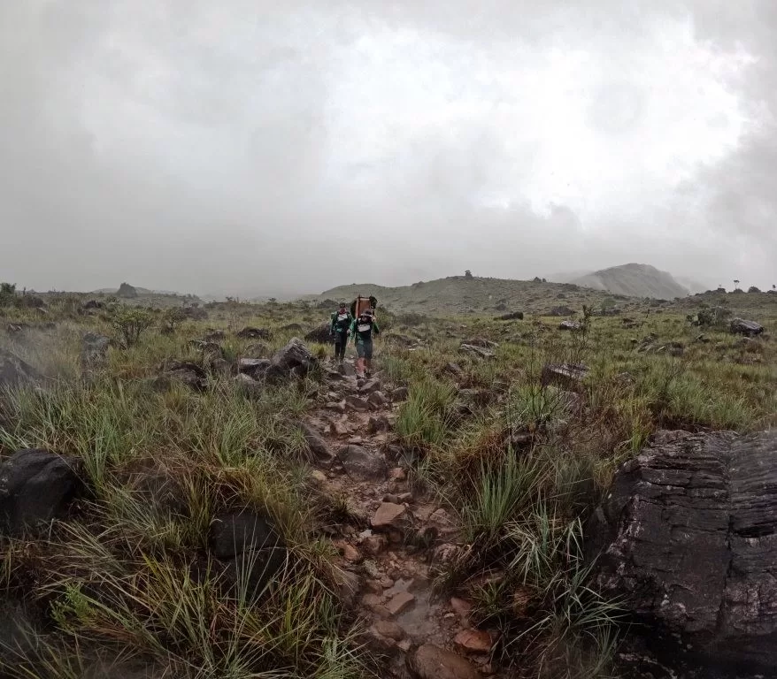 No platô do Roraima, a dificuldade se mantém: caminhadas de 10 a 20 km diários em terreno irregular, com poças, vento e neblina que reduzem a visibilidade. Já a descida, especialmente no Dia 6, soma 18 km de perda de altitude de 1.000 metros, sobrecarregando os joelhos em trilhas escorregadias, com travessias de rios que podem chegar à altura da coxa em dias de chuva.