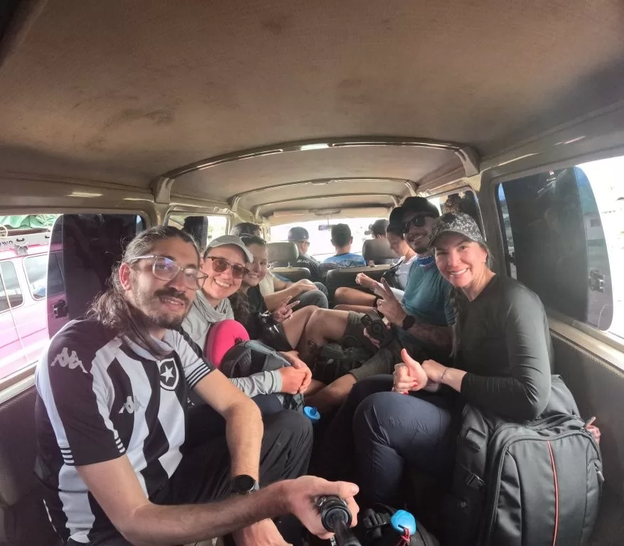 Após trâmites de imigração, veículos 4×4 levam 2 horas até Paraitepuy (1 hora em asfalto e 1 em terra), com parada para café no Quarto de Bode. Chegada por volta das 11h30, seguida de almoço e início da trilha. Imprevistos como carros quebrados podem ocorrer, mas equipes experientes resolvem rapidamente.