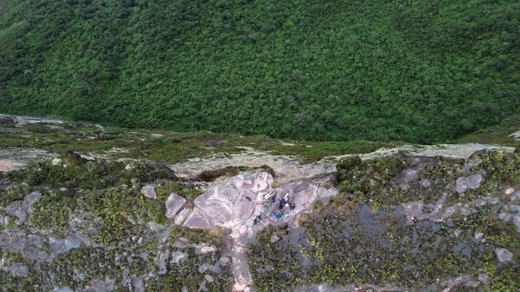 Enquanto a chuva continuava, aproveitamos o tempo para descansar e conversar. Assim que ela deu uma trégua, percebemos que o Mirante do Abismo Guácharo, que ficava ao lado do acampamento, estava acessível. Corremos para lá e fomos presenteados com uma vista deslumbrante: a floresta da Guiana, o Monte Kukenán, os paredões e a vasta Gran Sabana. Foi emocionante identificar o trajeto que fizemos nos últimos dias e relembrar cada acampamento por onde passamos.