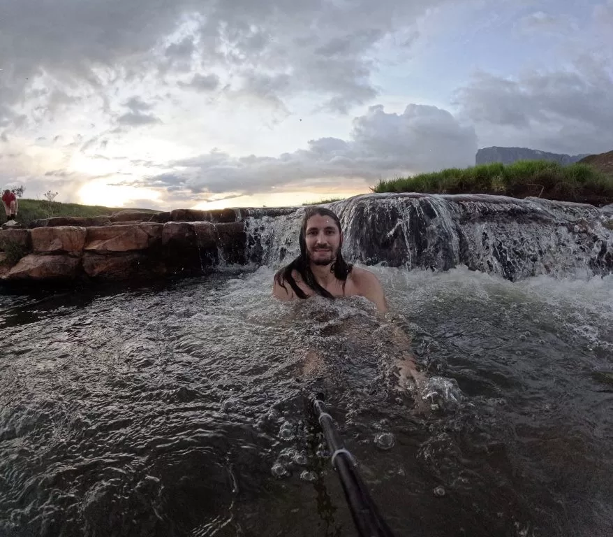 Por volta das 13h, finalmente chegamos às jacuzzis, piscinas naturais de água cristalina, cujo fundo é forrado por cristais de quartzo. Mesmo para aqueles que não acreditam em energias místicas, o ambiente transmite uma sensação única de vitalidade. O banho foi uma experiência incrível, apesar da água ser gelada. O sol apareceu momentaneamente, permitindo que eu voasse o drone e capturasse imagens espetaculares. Porém, uma chuva forte chegou repentinamente, me obrigando a pousá-lo rapidamente e molhando alguns de meus pertences. Quando o sol voltou, aproveitei para mergulhar novamente nas águas cristalinas. Foi revigorante e inesquecível.